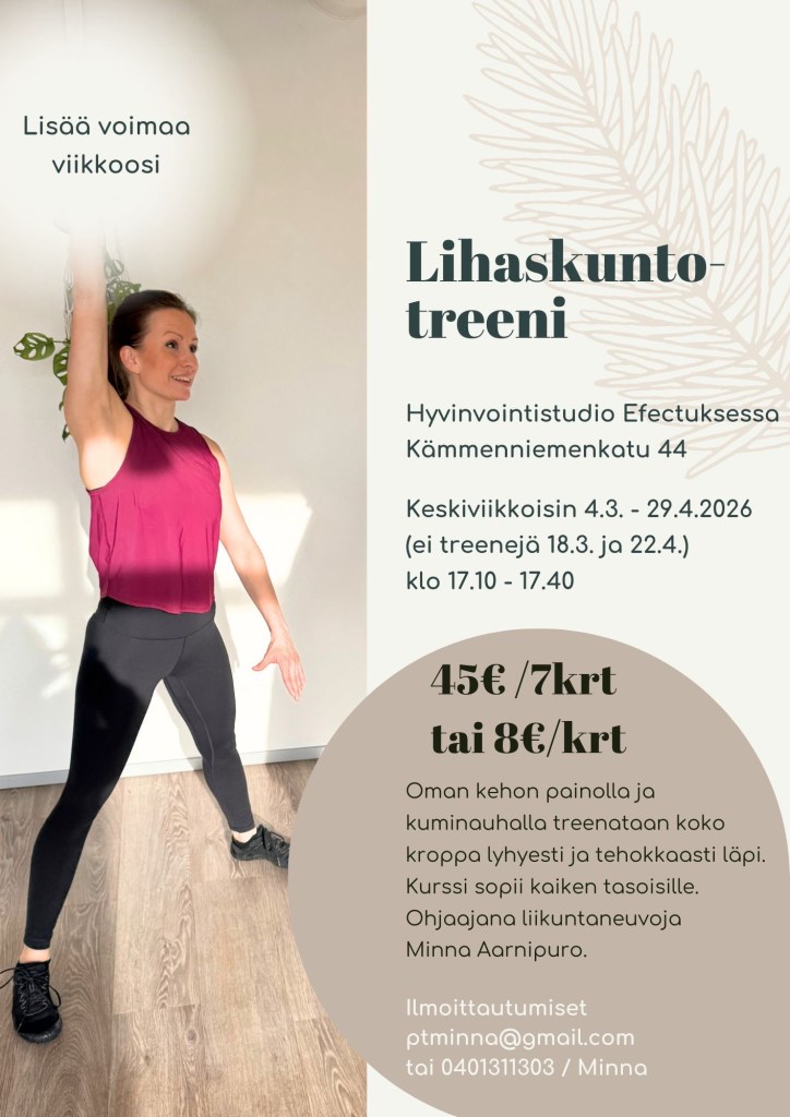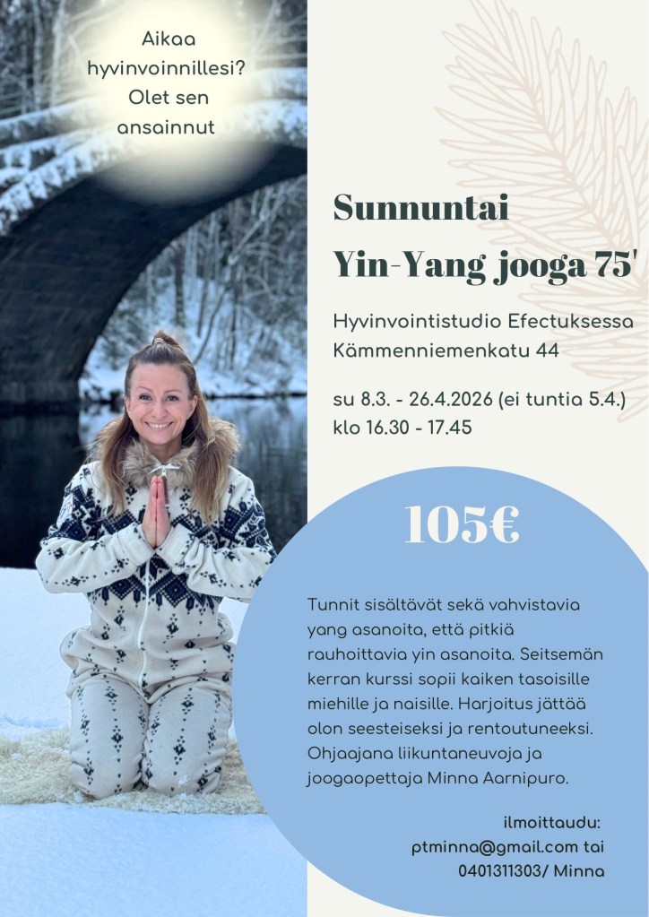 Lihaskuntotreeni, vinyasajooga ja yin-yang jooga: ptminna@gmail.com tai p. 040 131 1303 / Minna Aarnipuro